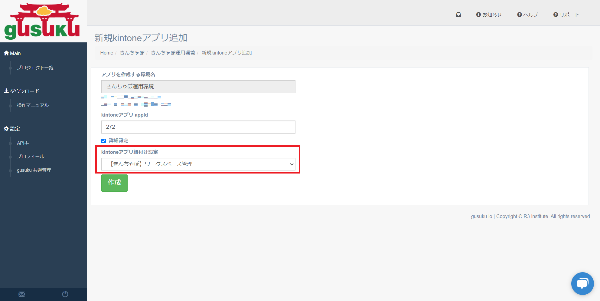 ここで追加するアプリがワークスペース管理アプリであれば、【きんちゃぼ】ワークスペース管理に紐付けていきます。