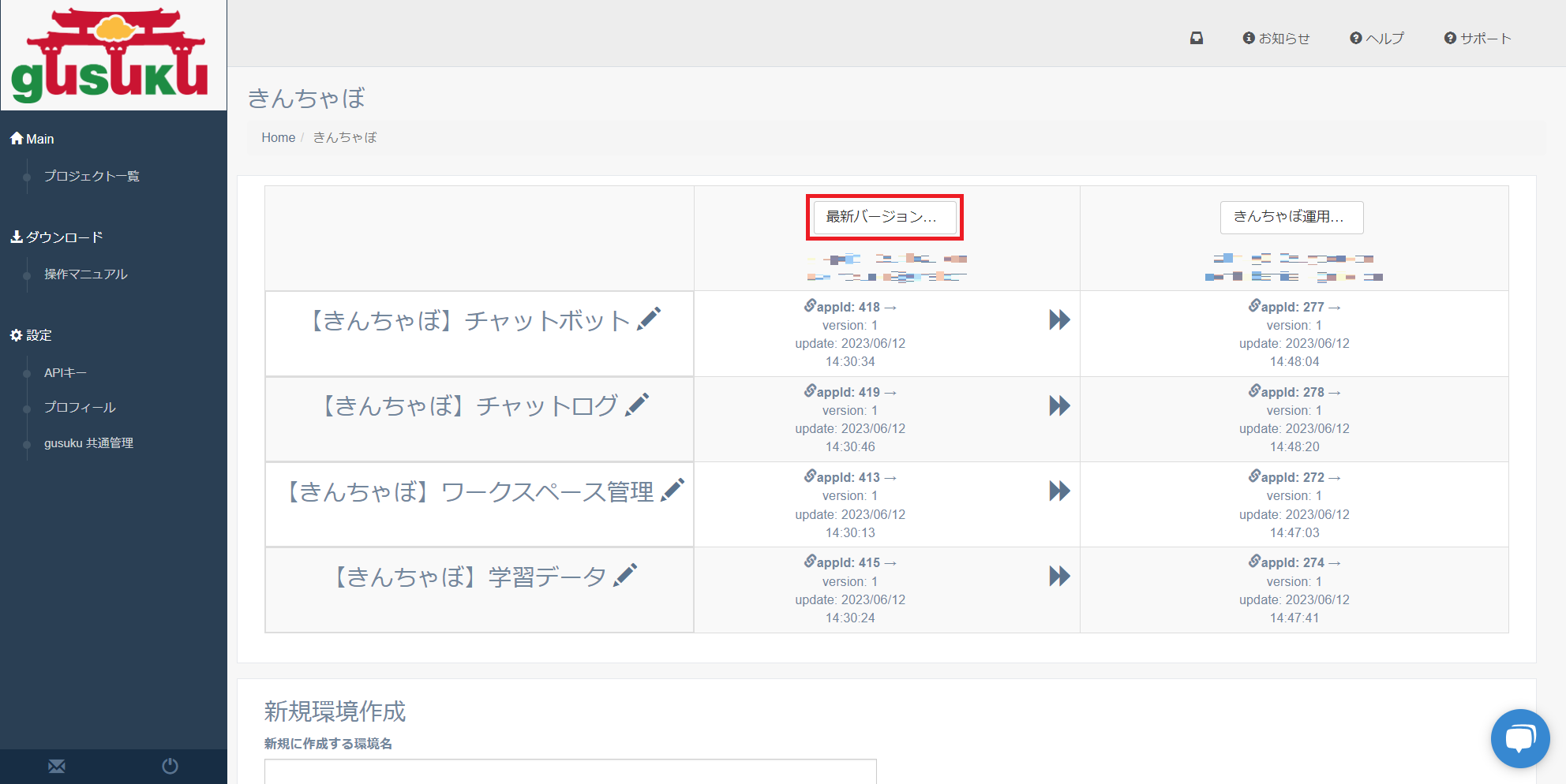 「きんちゃぼ運用環境」でバージョンアップするアプリのappIdをクリックします。