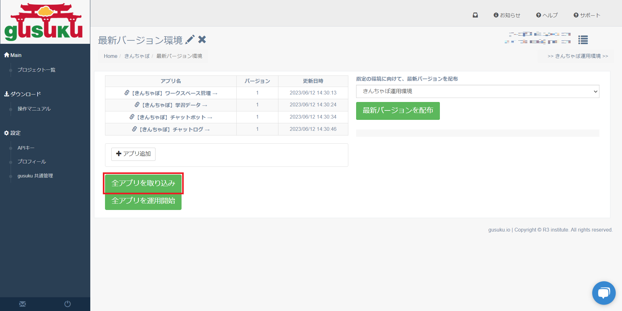 「全アプリを運用開始」をクリックし、最新バージョンのアプリの運用を開始します。
