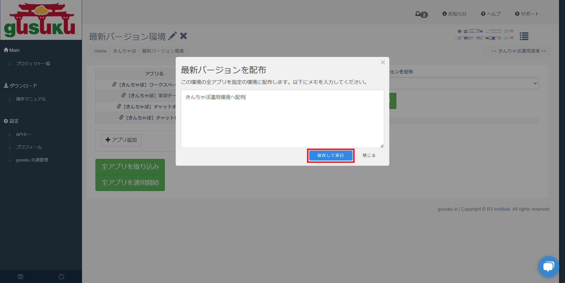 メモに「きんちゃぼ運用環境へ配布」と入力し、保存して実行します。