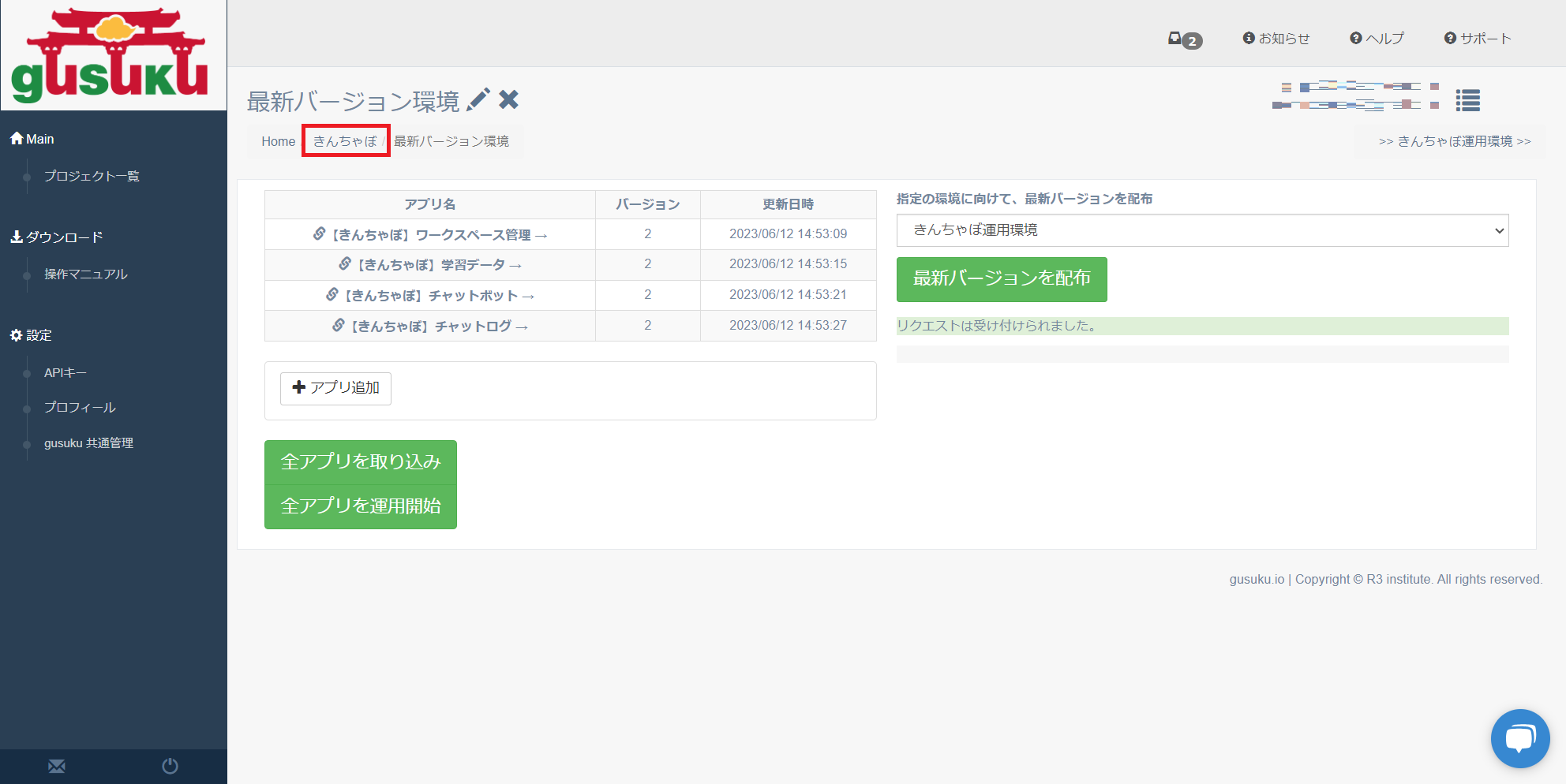 「きんちゃぼ運用環境」のアプリのバージョンが1つ上がると、最新バージョンのアプリの配布が完了します。
