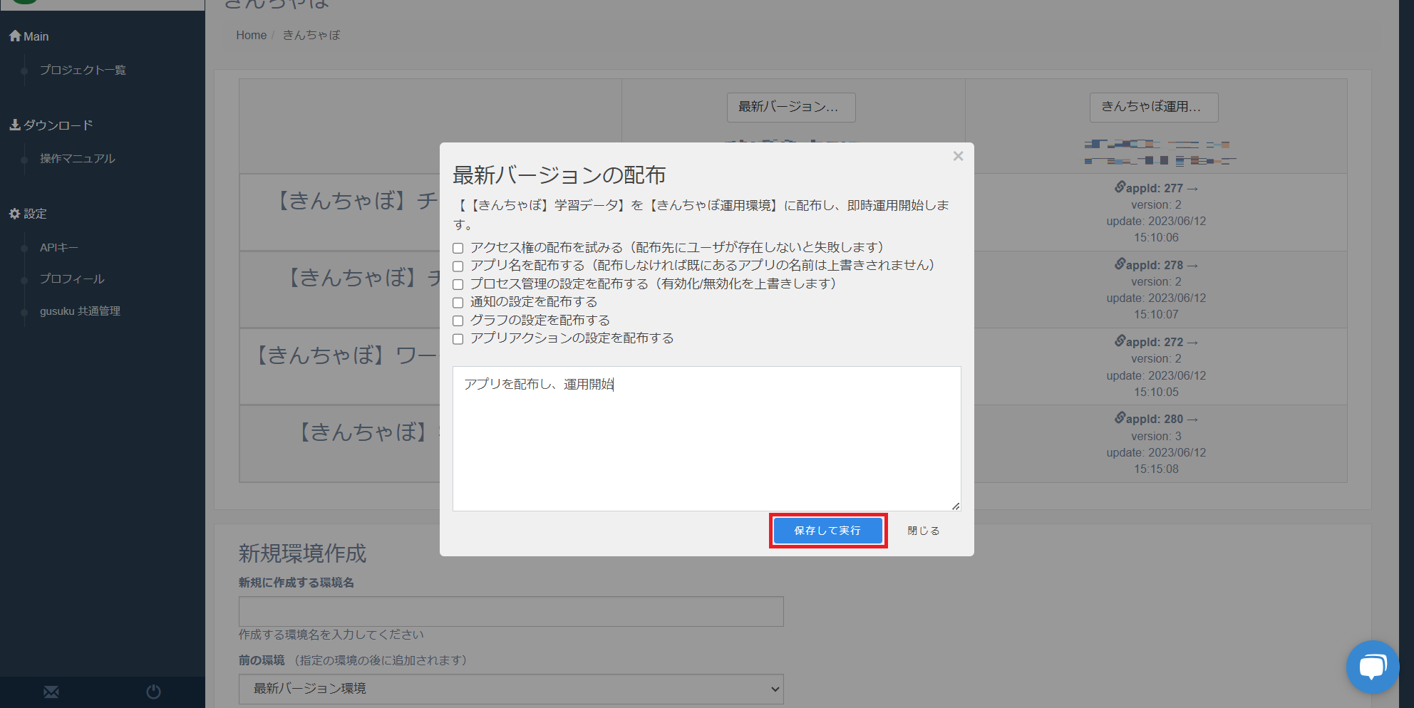 「指定の環境に向けて、最新バージョンを配布」を「きんちゃぼ運用環境」に設定します。