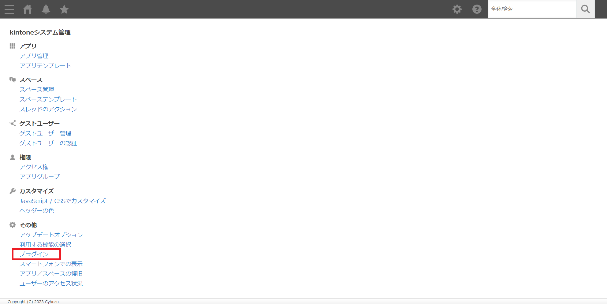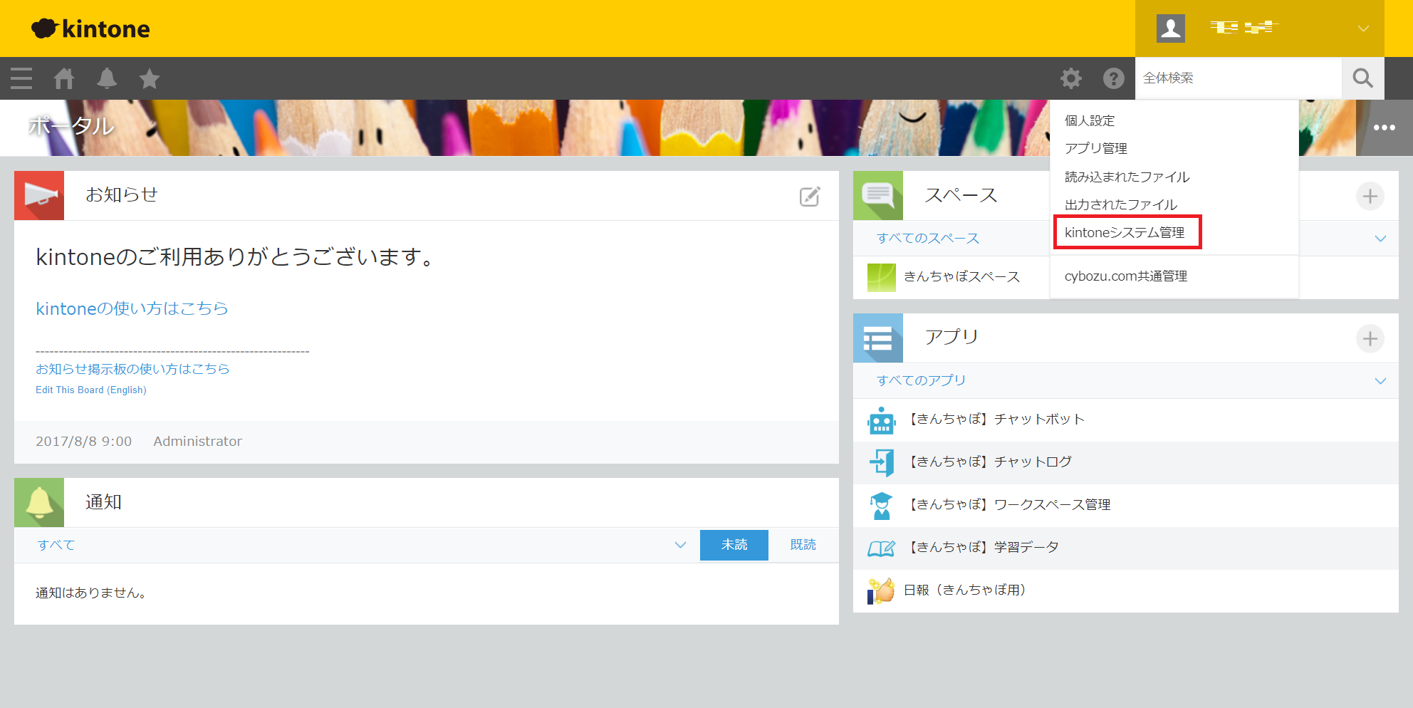 kintoneのポータル画面より、「kintoneシステム管理」を選択します。