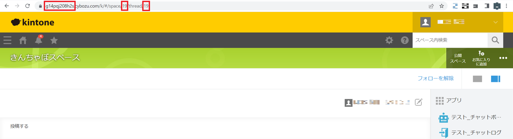次で使用するため、きんちゃぼを使用している環境の【サブドメイン】、【スペースID】、【スレッドID】をメモに控えます。