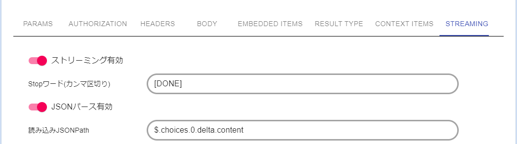 また、ストリーミング方式に対応した外部API利用する際は呼び出す外部APIの仕様を確認し、ストリーミングの設定を正しく行ってください。外部連携設定を行う画面にSTREAMINGタブが追加されています。ここでストリーミングを有効に設定する必要があります。
